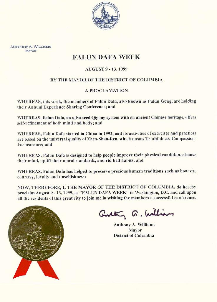 因此,我,华盛顿哥伦比亚特区市长,正式宣布1999年8月9日至13日,为华盛顿哥伦比亚特区“法轮大法周”,并且呼吁这座伟大城市的所有居民和我一起衷心祝愿法轮大法华盛顿心得交流会圆满成功。