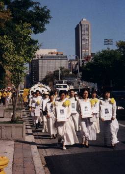 50位法轮大法女学员身着白色长裙,手捧在邪恶镇压中被迫害致死的死难烈士遗照作为前导,7尺直径构成的大花圈镶嵌着苍劲挺拔的巨大的“悼”字居中,数条横幅随后,上书大字“立即停止对法轮功的镇压”“在我们热爱的那片土地上,邪恶镇压法轮功,正在将中华民族推向灾难的深渊!”