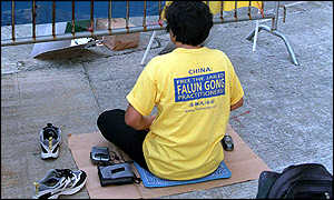 但是自从去年7月政府禁止了此团体并冠之以“邪教”后,法轮功成员在中国的政治中心天安门广场几乎每天都发起类似这样的抗议活动。