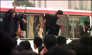 “法轮功好。法轮功好。”抗议者,主要是衣着朴素的妇女在警察试图关上她们所在的公共汽车的窗子时说。
