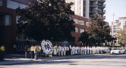 示威者指出,大陆当局在国家主席江泽民主导下,图谋在「十·一」国庆节前处决一批坚定的法轮功学员,以期「杀一儆百」,为此加拿大各大城市的法轮功学员特于昨天前往中国使领馆示威抗议。温哥华的示威行动也吸引了美国邻近地区的学员前来声援。像华盛顿州、奥勒岗州等未设有中国使领馆的地方,便有学员前来加入示威行列。