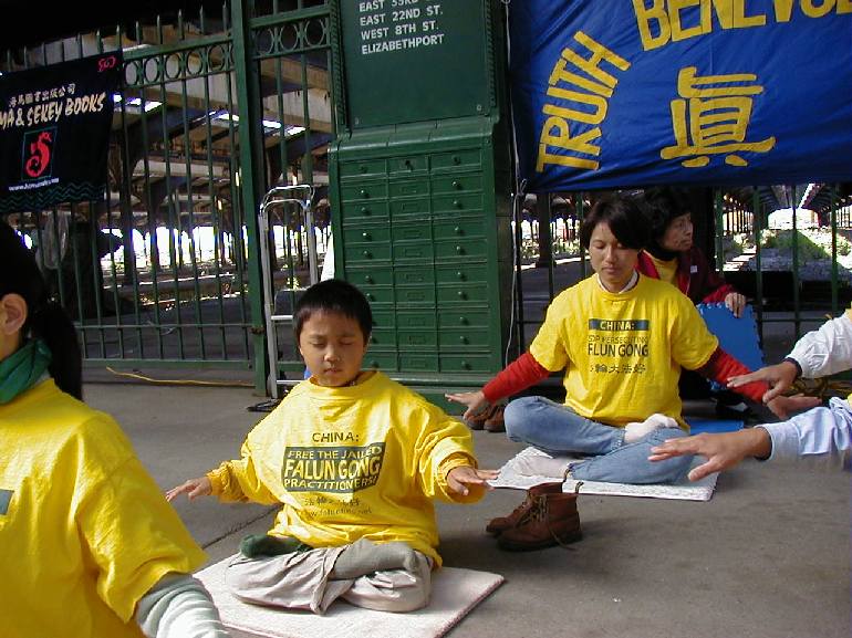 | 游人在观看大法洪传和国内弟子受迫害的图片 | 小弟子炼功 |