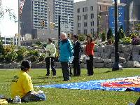 在清清的底特律河岸,五彩的气球洋溢着节日的气氛,沿河岸的“法轮大法图片回顾展”令众多的路人驻足观看,对中国政府的残酷镇压深表不解。中午时分,在一片平静祥和的炼功音乐中开始了我们的庆祝活动。大法弟子一如既往,向世人展示着五套功法。祥和的炼功场面顿令公园立刻改观,连当时在场的CBC摄影师也不禁感慨,这一切是这样美好。随后,在约半小时的庆祝会上学员宣读了新闻公告,温莎市褒奖,以及回顾了加拿大总督写给加拿大法轮大法周的贺信。温莎市国际特赦组织分部的科罗列教授,当听到法轮大法周庆祝活动的消息后,特地赶来表示祝贺并对中国法轮大法学员及其人权状况深表关注。81岁高龄的教授发言后高兴地对一位本地学员说,我的听觉好了不少。