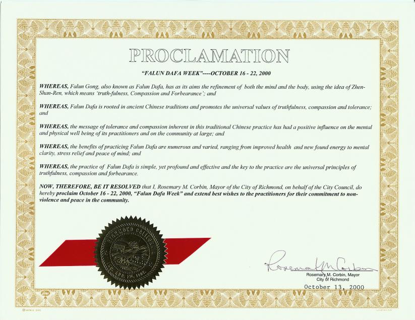 现在,我,列治文市市长罗斯玛丽.M.考宾,代表市议会,特此宣告2000年10月16-22日为“法轮大法周”,并且因法轮大法修炼者们致力于非暴力与和平的社会而再向他们致以最美好的祝愿。