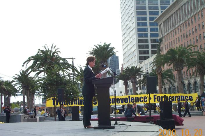 (三)、学员们在游行的终点处集中参加了由三位美国国会议员蓝托斯(Lantos)、裴洛西(Pelosi)和艾许(Eshoo)联合举办的“法轮大法新闻发布会”。会上,大法学员代表宣读新闻发布稿揭示了大陆学员所遭到的迫害真相,玛琪瑞(Margery)女士代表蓝托斯先生发言。裴洛西议员女士刚下飞机就直接赶到会场,并作了深刻有力的发言,她说:“如果中国政府一日不停止对法轮功学员的迫害,我们就一日不停止道义上的谴责”。各家中英文媒体争相进行了采访报道。
