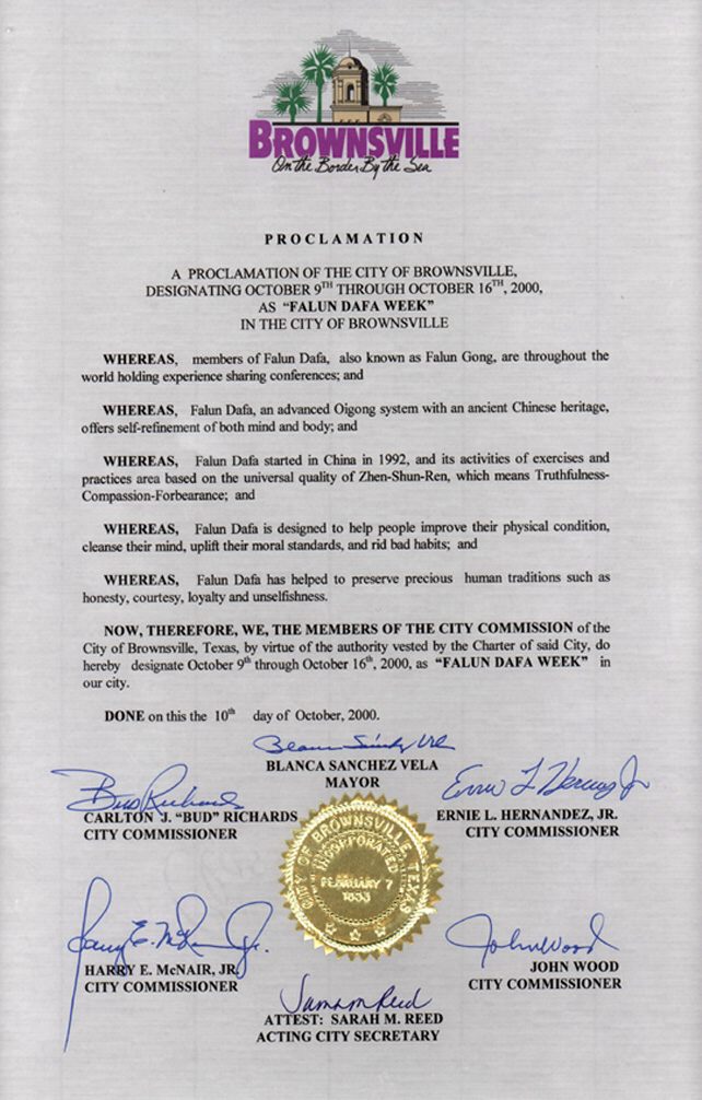 同时在布朗斯维尔市,市长及各市政官员不但发出对法轮大法的褒奖,而且精心制作了一块精制的匾将褒奖书装饰起来,显得格外庄重。
