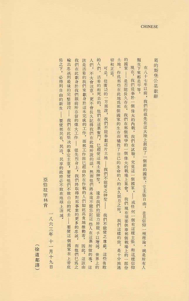 【明慧网2000年10月26日】 在国际上逢人便搔首弄姿、卖弄不止的江泽民似乎对亚伯拉翰·林肯的哥德斯堡演讲熟谙在心、朗朗在口。然而,看了下面的该演讲全文,任何心智齐全的人都会有同感:江泽民玷污了哥德斯堡演讲的精神。当然,还有一种可能,就象他那“我欲乘风归去”的吟诵一样,自己都不知道自己口中在说些什么。害了法轮功那么多人、早就在地狱里遭报的人了,乘的不是那里的阴风还能是什么呢?中南海里再多几个算卦的,也必将于事无补。江氏大势已去,悔之晚矣!