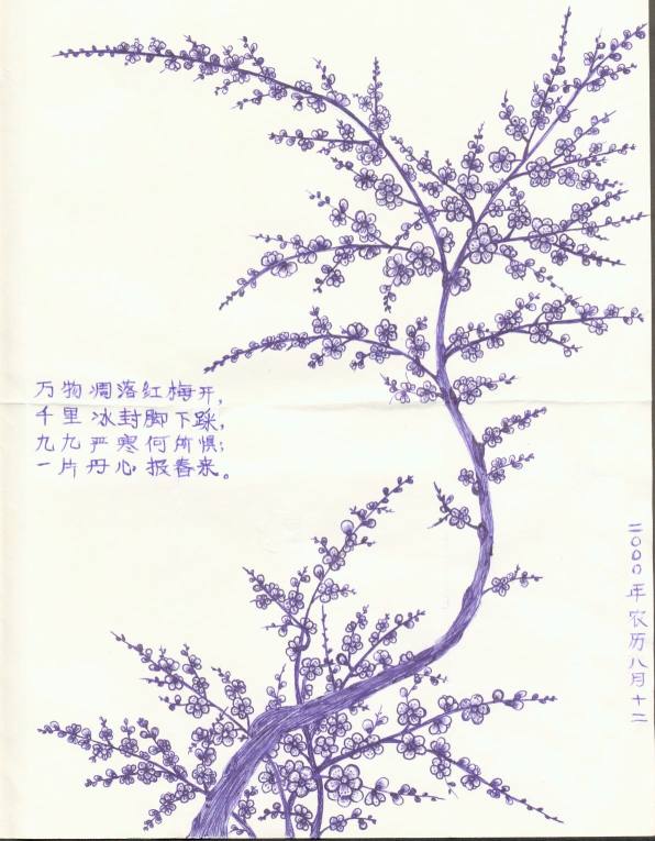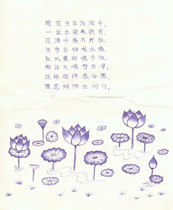 【明慧网2000年10月29日】 注:此图几经辗转周折从狱中传出,是狱中同修用蓝色圆珠笔精心绘制而成的,同时题有小诗二首,一纸千金,凝聚多少力量才能出现在你我手中。