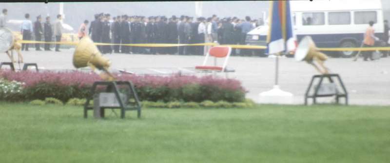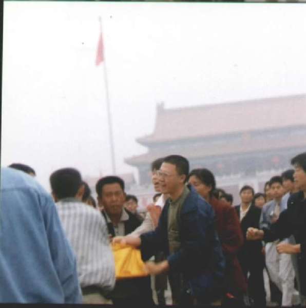 警察匆匆将抗议者们轰上等待着的公共汽车,目击者称,看见抗议者们被踢打。当时天安门广场上挤满了游客,警察追打抗议者时,一些游客也被推到一旁。