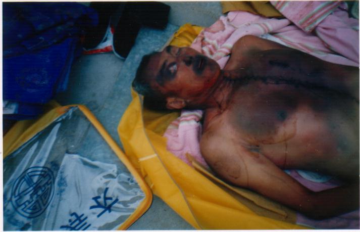刘玉风,男,64岁,汉族,中共党员,山东文登宋村镇小泽头村人,只因在7月18日上午参加文登龙山集体炼功被抓至文登看守所,遭公安人员残暴毒打,遍体鳞伤,令人惨不忍睹。于23日早7时含冤去世。刘去世后,其子女怨愤难忍,欲打官司讨回公道,尸体不准火化。一位身体健康,精神矍烁之老人瞬间即逝,令亲朋好友难以接受。