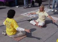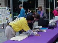 当地的新闻媒体对我们进行了采访和录像。虽然整个活动只有四个小时, 人数也只有一千左右,学员们认真的奔走于各处散发资料和洪法。 来参加健康节的都是关于医疗健身的组织,他们都非常友好礼貌,有的还主动来我们的展位学习功法。 来往的游客都驻足于大法图片之间,读到关于国内弟子受到迫害的消息, 几乎每个人都深表同情。 大部份人主动地拿去了大法的资料;许多人在我们准备的呼吁信上签字,恳请美国的两位总统候选人重视中国的法轮功人权问题;还有不少人留下了他们的姓名和地址以便将来参加学法炼功。