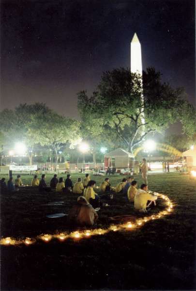 为了坚决制止江泽民这种严重违法乱纪,为害中国,为害本国人民的罪恶行径,我们--美国首都华盛顿DC地区的法轮大法修炼者决定,从即日起在中国大使馆门前举行每周一次的烛光纪念活动,要求中国政府帮助我们制止江泽民为害中华的无耻罪行,和平解决法轮功问题。