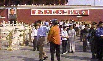 图为在NBC主持人华莱士访问江泽民的节目中出现的中国法轮功学员在天安门广场炼功和被抓的镜头。(多维社)