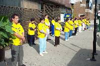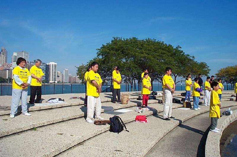 十.一前夕,华人的各式活动使得芝加哥市中心街头异常热闹,除在法兰克林街上举办的首届芝加哥中国日游行外,近八十位法轮功学员则选择在中国大陆驻芝总领馆前举行另类的庆祝十.一活动,学员鹿丰表示,当日前往领馆前炼功的学员多来自中国大陆,和参与中国日游行人潮一样,以欢欣鼓舞的心情在国庆前夕祝愿中国繁荣强大,他们强调法轮功学员支持中国政府,但却反对把镇压法轮功当成巩固及满足权势私欲的江泽民等个别人士,学员们当日除在领馆前进行全日的抗议外,并派代表在中国日游行路线两旁向民众散播传单,要求江泽民停止迫害国内的法轮功学员,不过法轮功学员的抗议活动并未随游行结束而落幕,由于风闻大陆公安再度在天安门逮学员,一日又有三十名学员前往驻芝总领馆抗议,谴责江泽民的暴行。(图与文/张惠姿)