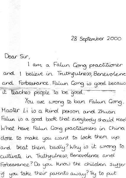你禁止法轮功是不对的。李老师是一个很好的人,《转法轮》是一本每个人都应该读一读的好书。在中国的法轮功修炼者到底做了什么使你想把他们都关起来还要折磨他们呢?修炼真善忍有什么错呢?你知道你把小孩子的父母带走的时候,他们有多难过吗?请试着替他们想一想,难道你没有善心吗?