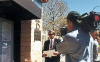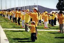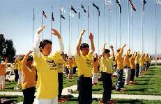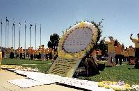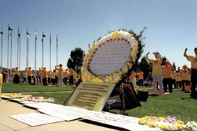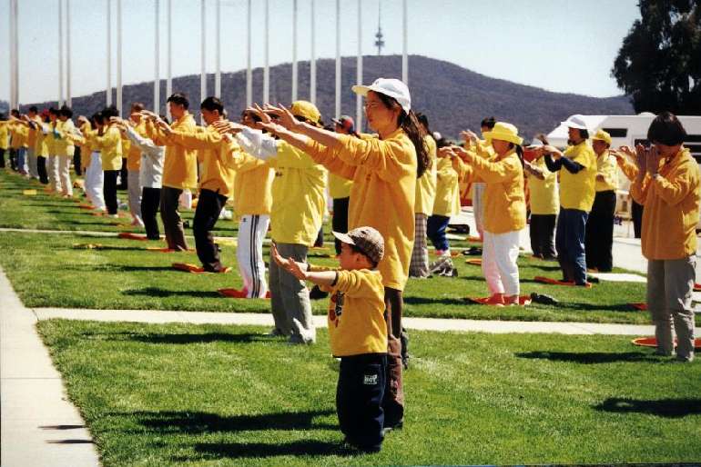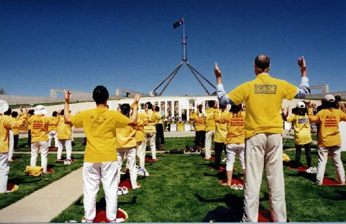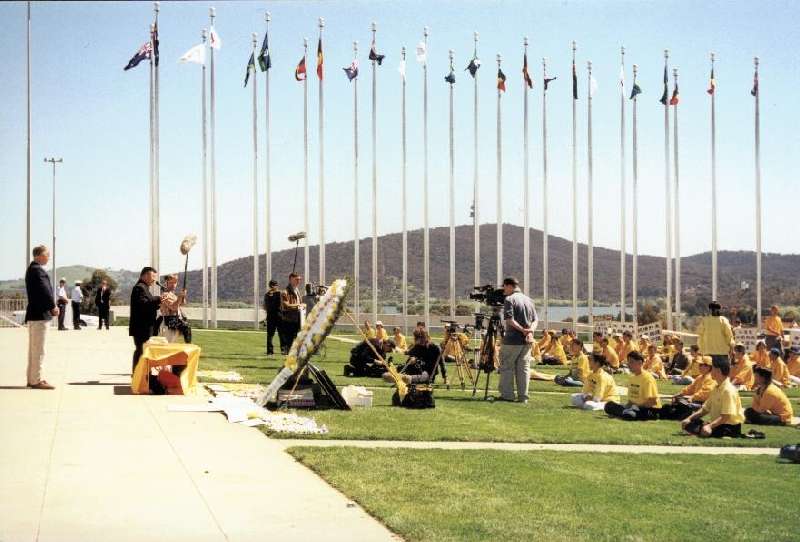 清早5点半几位学员就从悉尼出发赶到议员们开会之前把最新的资料递进了国会。当天风和日丽,国会山庄的广场上摆满了各式的横幅及图片,全面展现了大法的洪传及中国迫害法轮功的真相,最引人注目的是学员连夜赶制的大花圈,上面写着五十几位为大法献身的学员的名字,下面是醒目的大陆弟子被迫害的事实。四家主要的大媒体现场采访了我们,他们是澳洲九号电视台、ABC、Carbarra Times和路透社。澳大利亚法轮功发言人向媒体宣读了我们的呼吁书,首先感谢了澳洲政府这一年多来对我们的支持,并呼吁他们继续给予我们更多的支持和帮助来制止江泽民们这种失去理性的残酷的迫害行为。一百多位身着黄T恤的学员在国会山庄的草坪上展示了法轮功五套功法,用祥和宁静的场面向广大媒体表达了我们的诉求,并希望澳大利亚人民通过见到这样一群祥和的人群却在中国遭到如此血腥的镇压能发出正念,了解和支持我们。一位学员还到了国会里面会见了二位议员,通过他们向国会的议员们介绍中国发生的一切,希望他们给予我们帮助和支持。