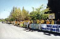 这时正好来了一个从大陆的旅游团,一行大约20人到达了大使馆门前,学员马上把有关的中文资料和图片递给他们,他们都特别有兴趣,仔细的观看又询问了很多问题,普遍的反映都是非常吃惊发生了这些残酷的事实。这使我们认识到向中国大陆人民讲清真相的重要性,他们是受蒙骗最深的人群。大使馆活动结束後,我们又游行到了坎培拉市中心,沿途举着我们的横幅和标语,尽量让行人和车辆看清我们的诉求。每一个护法和洪法的活动都使我们感受到太多善良的人们等待着我们去讲清真相。面对邪恶的猖獗,只有勇敢的站出来,呼唤正义,才有光明的明天。