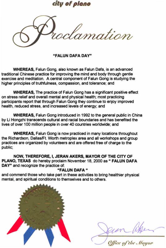 因此,现在,我,耶仁阿克斯,德克萨斯州普拉诺市市长宣布2000年11月18日为“法轮大法日”,并褒奖“法轮大法”的修炼,同时表彰参加该活动的人将更健康的身体,思想和心灵带给他们自己和他人。
