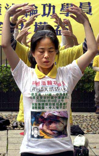 2000年11月17日,星期五,一个法轮功学员身穿印有刘玉凤遗体照片的T恤在香港炼功,刘玉凤是被禁的法轮功精神运动的成员,据传死于中国大陆监狱的酷刑折磨。法轮功学员向香港政府请愿,要求帮助寻找一名学员,因他在提交起诉江泽民的诉状后失踪。法轮功在中国大陆被禁,但在香港仍属合法。