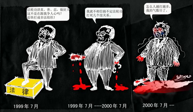 然而,面对纯正纯善的伟大力量,1999年7月20日,中国国家主席江泽民,违背国家宪法和法律,盗用政府名义,试图取缔法轮功,并动用一切国家机器作为他的喉舌,捏造事实,颠倒是非,污蔑诽谤李洪志老师及法轮大法。刹时间,九百六十万平方公里的中国大地上,没有人权,没有道义,没有公理,没有法律,只有血雨腥风。一年多来,在他一手策划下,60多名无辜的生命被迫害致死,成千上万“打不还手,骂不还口”的修炼者被酷刑折磨,多少家庭流离失所,家破人亡,老人失去儿女,孩子呼唤父母,女学员被扒光衣服投入男牢,孕妇被迫堕胎流产,正常人被强行送往精神病院,这种活活地把人间变成地狱的残暴仍在持续蔓延。江泽民灭绝人性、令人发指的罪行罄竹难书。