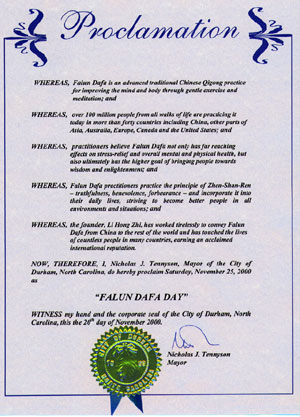 尽管中国迫害法轮功,真善忍在德伦市将受到保护-北卡州德伦市宣布11月25日为“法轮大法日”。