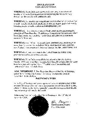 萨拉托加市市长,代表市议会,在此宣告,2000年11月18日至24日为萨拉托加市的法轮大法周,并鼓励我们的市民们认识这种古老的中国的炼习