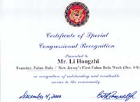 美国国会议员向李洪志大师颁发特别国会奖励证书