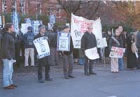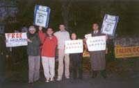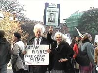 约下午3点钟,大家乘两辆大轿车抵达中国使馆。莫恩议员进使馆递交呼吁信,声明赵明是无罪的,呼吁中国政府尽早释放他并让他回爱尔兰完成学业。大家举着写有英文“Free Zhao Ming(还赵明自由)”、“Release Zhao Ming(释放赵明)”、“Let Him Go Today(立即放人)”等和中文“释放赵明”、“还赵明修炼法轮功的自由”的标语横幅,在使馆前抗议。参加使馆前集会的有一百多人,除学生外,有社会上从头一天《爱尔兰时报》上看到消息而来支持的,还有从另一城市Cork赶来支持的,还有几个十多岁的小学生也来支持,并坚持到最后。据Trinity学生会的负责人讲,这是他们一年来参加人数最多的一次活动,就连以前为学生争取助学金的集会都没有这么多学生参加。有的学生是下午自己骑自行车来的。