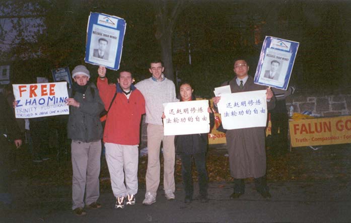 中国使馆在当天下午曾给Trinity研究生会用传真发了个所谓的“通告”,声称“法轮功对几千人造成了伤害”、对法轮功的镇压“得到了全社会的拥护”、“不排除拷打赵明的情况是捏造的”云云。在信仰和言论自由的西方社会,谁会相信哪一套骗人的谎言。我们对使馆工作人员这种盲目重复江泽民之流编造的愚弄群众的谎言、没有正义地所谓“执行上级指示”的做法感到可怜和可悲,他们没有想到他们这样做将会成为江氏的陪葬品、断送了自己生命的未来。不过他们也提到,“赵明的情况需要核查”,怎么核查和核查的结果,全世界所有正义之士拭目以待。