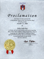 奥斯汀市褒奖书 我,科克.威特森,德克萨斯州奥斯汀市市长,在此宣布2000年10月21日为奥斯汀市 法轮大法日 诚请所有市民和我一道祝贺法轮大法讲座今天在这里举办;褒奖法轮大法这一中国古老的气功/修炼;鼓励奥斯汀市民通过炼功和消除压力获得健康。
