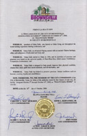 布朗斯维尔市 褒奖 布朗斯维尔市宣布2000年10月9日─16日为布朗斯维尔市 “法轮大法周” 鉴于,世界各地法轮大法,又称法轮功,学员召开经验交流会; 鉴于,法轮大法是高层次气功修炼体系,是中国的古老文化遗产,提供了身心的自我完善; 鉴于,法轮大法于1992年从中国传出,而且它的修炼活动立足于宇宙特性“真、善、忍”; 鉴于,法轮大法帮助人们提高身体健康,净化心灵,升华道德,和去除坏习惯; 鉴于,法轮大法使人类维持了诚实、谦逊、忠诚和无私等珍贵的传统美德; 在此,我们德克萨斯州布朗斯维尔市委员会的成员以该市章程所授予的权力命名2000年10月9日至16日为我们市的“法轮大法周”。