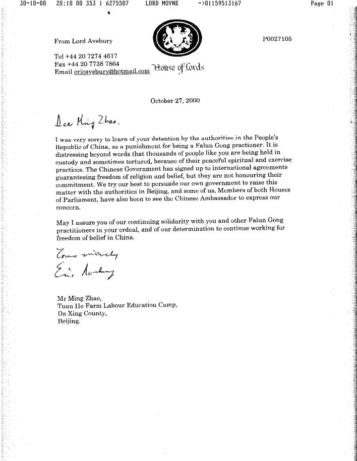 | 爱尔兰法轮功学员赵明 | 阿维布理爵士的信件原件 |