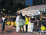 波士顿地区的法轮功学员上周在波士顿考柏利广场举行「烛光追悼会」,哀悼六十七名在大陆遭到逮捕并被虐死的同修们。在广场中搭设的帐篷上挂着「中国停止镇压」「尊重人权」的横联标语,展示受迫照片,和相关资料。参与的学员们穿着黄色T恤,或在广场静坐炼功,或向路人散发传单,向许多好奇停步者解释缘由。天色暗后,大家点燃烛光,一起追悼在大陆被迫害致死的同修们,也希望唤起海外人士的关心,共同谴责中国迫害法轮功学员的罪行。(文:唐嘉丽,图:由法轮功学员提供)