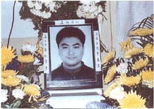 10月7日上午9时,武汉市一百多位大法弟子在布满巡警、警车的包围圈里参加了“蔡铭陶告别仪式”,灵堂布置得庄严肃穆。蔡铭陶生前工作的单位武汉市教育学院外语教研室主任,在会上介绍了他的生平。男,27岁,英语助教。对工作认真负责,待人诚恳,群众关系很好,教学深受学生欢迎。是一位优秀的青年教师。他的不幸去世师生们都很悲痛!
