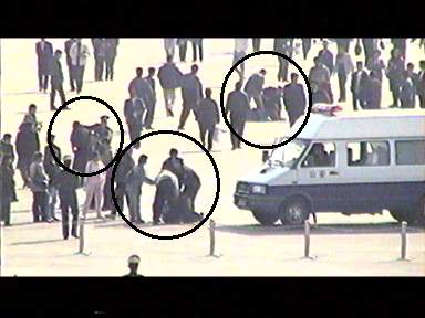 | 3. 又有几名弟子被押上车 | 4. 一名便衣将手无寸铁的弟子按在地上殴打 | 5. 两名便衣嗅到气味后,和警车一道狂奔过去 |