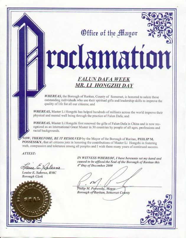 在此,为了表彰李洪志大师带给所有人的“真善忍”,作为亚瑞谭市市长,菲力普 M.朴赛斯克,我决定,让全体市民与我一起向李洪志大师致敬,并祝愿李洪志大师及法轮大法不断取得成功。