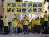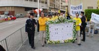 ![]() 4.学员捧着纪念死难者花圈走向中联办递信 | ![]() 5.在中联办对面炼静功 |