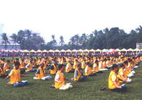 上午9点40分高雄地区有八十几位学员包了两辆游览车为洪法共襄盛举,并利用一小时与台南学员共同学法交流。接着大会安排的表演活动,我们于10点40分上场表演五套功法。烈日下,每个人的脸上带着祥和之气配合着动作,同时间有的学员在旁边现场教功。也有些小学员顶着烈日在人群中分发资料,一手拿汽球送小朋友,一手拿资料。让我看了欣慰又感动。其中有一位是小女,六岁瘦小的身影见到人就问:「请问要大法资料吗?」后面还加了一句:「法轮大法好!」也发了不少资料。