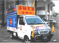 在大门入口处,摆了两台学员专为台南各乡镇洪法时所设计的宣传车,非常醒目。其中有一台还装设了电视墙,现场也吸引了许多围观民众,达到了宣扬大法的效果。这些都是学员精心设计的,他们那颗为大法付出的心真令人佩服。