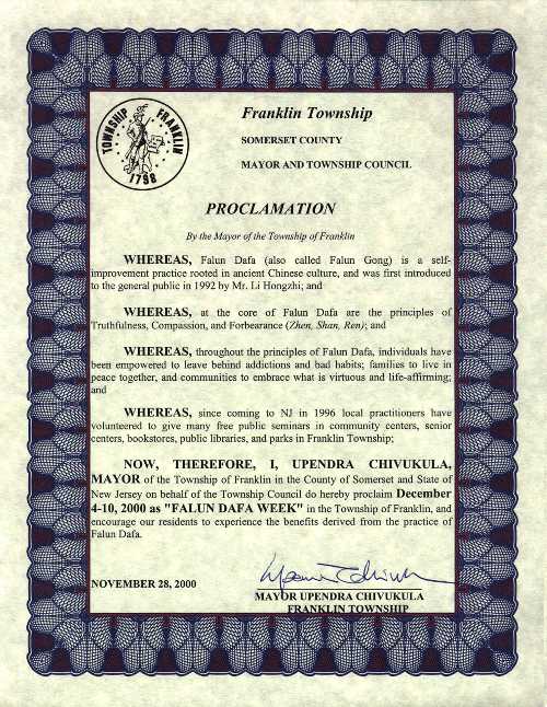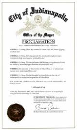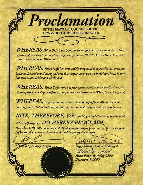 十二月十二日,位于芝加哥近郊的北布鲁克和香帕分别在定期举行的市议会上宣布:十二月十日至十六日为该市的“法轮大法周”。市长亲自将证书发给法轮功学员代表。