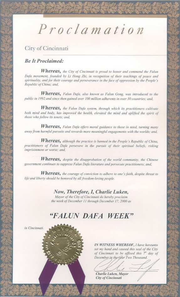 【明慧网2000年12月15日】俄亥俄州辛辛那提市市长宣布2000年12月11-17日为法轮大法周