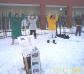 【明慧网2000年12月15日】 多伦多从昨天开始大雪纷飞,今天(12月12日)凌晨已有1尺多厚的积雪。大风加大雪使多伦多的气温降到了摄氏零下26度。寒冷的天气,阻塞的交通,没有阻挡住大法弟子继续到中国领馆和平请愿。有的功友照例提前1小时到领馆门前派送报纸,有的功友在寒风中不顾把手冻僵一直举着要求中国政府释放张昆仑教授的横幅。江泽民之流一天不停止对法轮功的