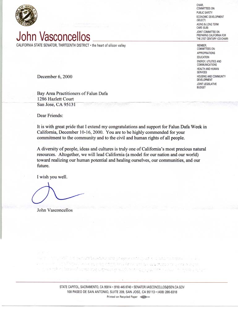 我非常骄傲地向2000年12月10日至16日的加利福尼亚州法轮大法周表示祝贺和支持。你们应该受到高度的赞扬,因为你们对社区及所有人的民权和人权所作出的承担。