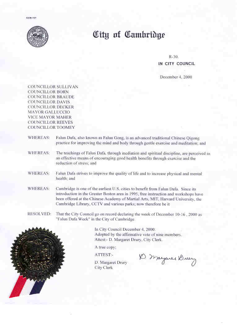 鉴于:剑桥是美国最早受益于法轮大法的城市之一。自从1995年法轮大法介绍到大波士顿地区以来,在中国武术学校,麻省理工学院,哈佛大学,剑桥图书馆,剑桥公共电视及许多公园进行了免费介绍和教功;在此
