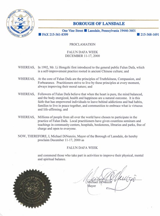【明慧网2000年12月19日】 宾州兰斯德尔区市长宣布法轮大法周(2000年12月11日--17日)