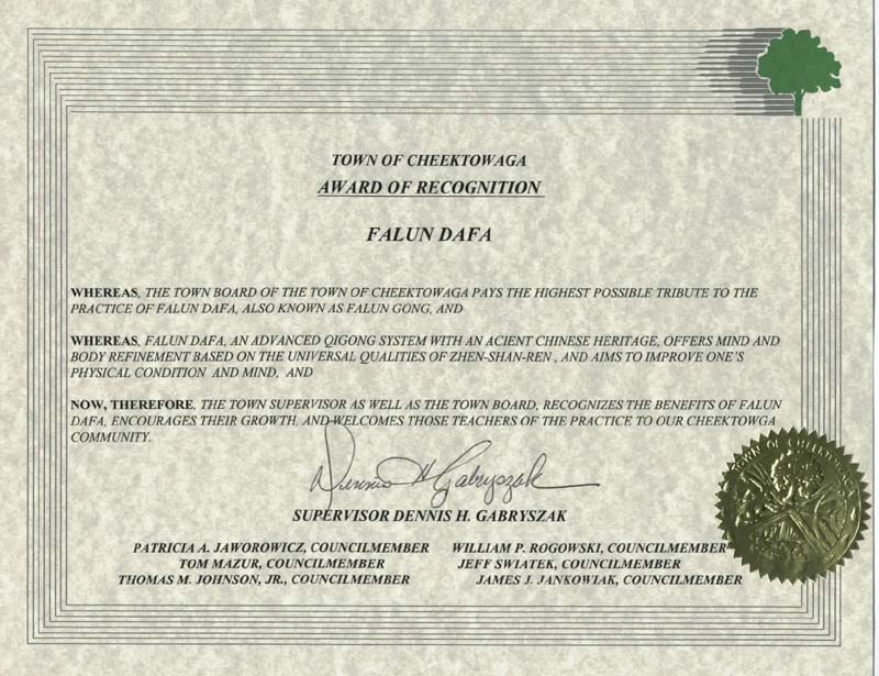 有鉴于,奇托瓦加镇全体镇董事会向法轮大法,也称法轮功,致与最崇高的嘉奖;