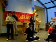 宽敞的大厅正中央悬挂着“法轮大法─真善忍”横幅。大厅前方悬挂着红底黄字“法轮大法周”横幅。大厅四周摆放着法轮大法图片板,上面真实地记述着八年多来法轮大法在世界各地的弘传和一年多来江泽民一夥对法轮大法的残暴镇压的情况。印有英文“法轮大法”的五彩气球把大厅点缀得更加清新融融和喜气洋洋。提前感到的学员有的随着悠扬的炼功音乐轻柔地炼着功法,有的向路过的人发放大法介绍材料,有的在向感兴趣的人教功,有的在轻声地交流着。大厅溶于一片祥和温馨之中。