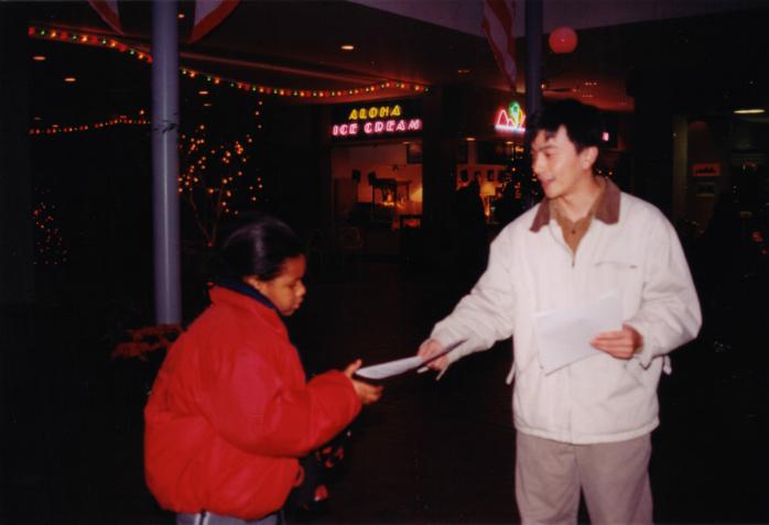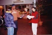 昨天,大约50名地方上的法轮功成员来到波士顿的街上向人们解释中国17个月前开始的镇压法轮功的真相。根据他们的宣传材料,数万名修炼者已经被逮捕、殴打、开除工作、开除学籍、强迫退出居所以及被投入劳改营。他们说至少有90名成员在过去一年里已经死于警察拘押。