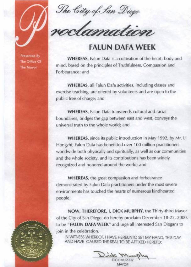 【明慧网2000年12月20日】 加利福尼亚州圣迭戈市宣布2000年12月18日至22日为“法轮大法周”。