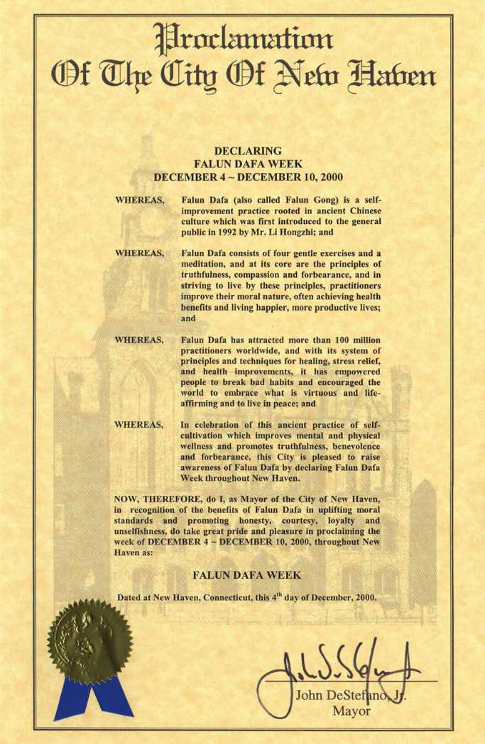 【明慧网2000年12月20日】 康卅纽黑文市与桔子镇宣布十二月四日至十日为“法轮大法周”。十二月四日纽黑文市市长亲自主持了在市政府举行的法轮大法周颁奖典礼,学员做了功法表演,当地电视台和广播电台的记者到场作了采访与报导。当地报纸采访了我们在市图书馆举办的大法介绍会并作了正面报道。当地有线电视反复播放了法轮功真实故事上下集。学员们充分利用这些条件在当地举办多次介绍会。市购物中心的经理对我们热情支持让我们在圣诞节购物旺季在购物中心设展板、表演功法、与散发传单。